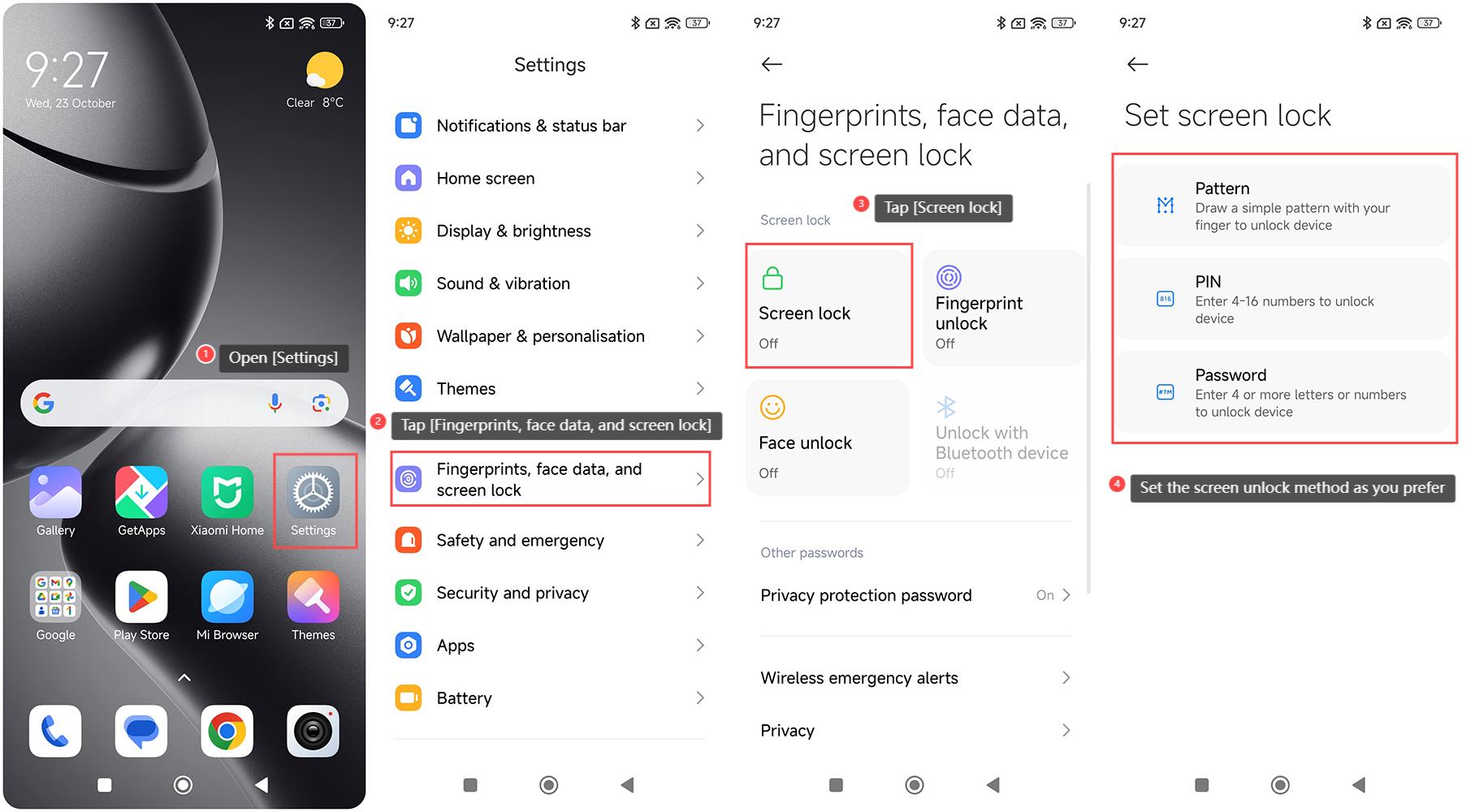 4. Antarmuka ini mencakup tiga metode: Pola, PIN, dan Kata Sandi. Anda dapat mengatur metode buka kunci layar sesuai keinginan Anda;