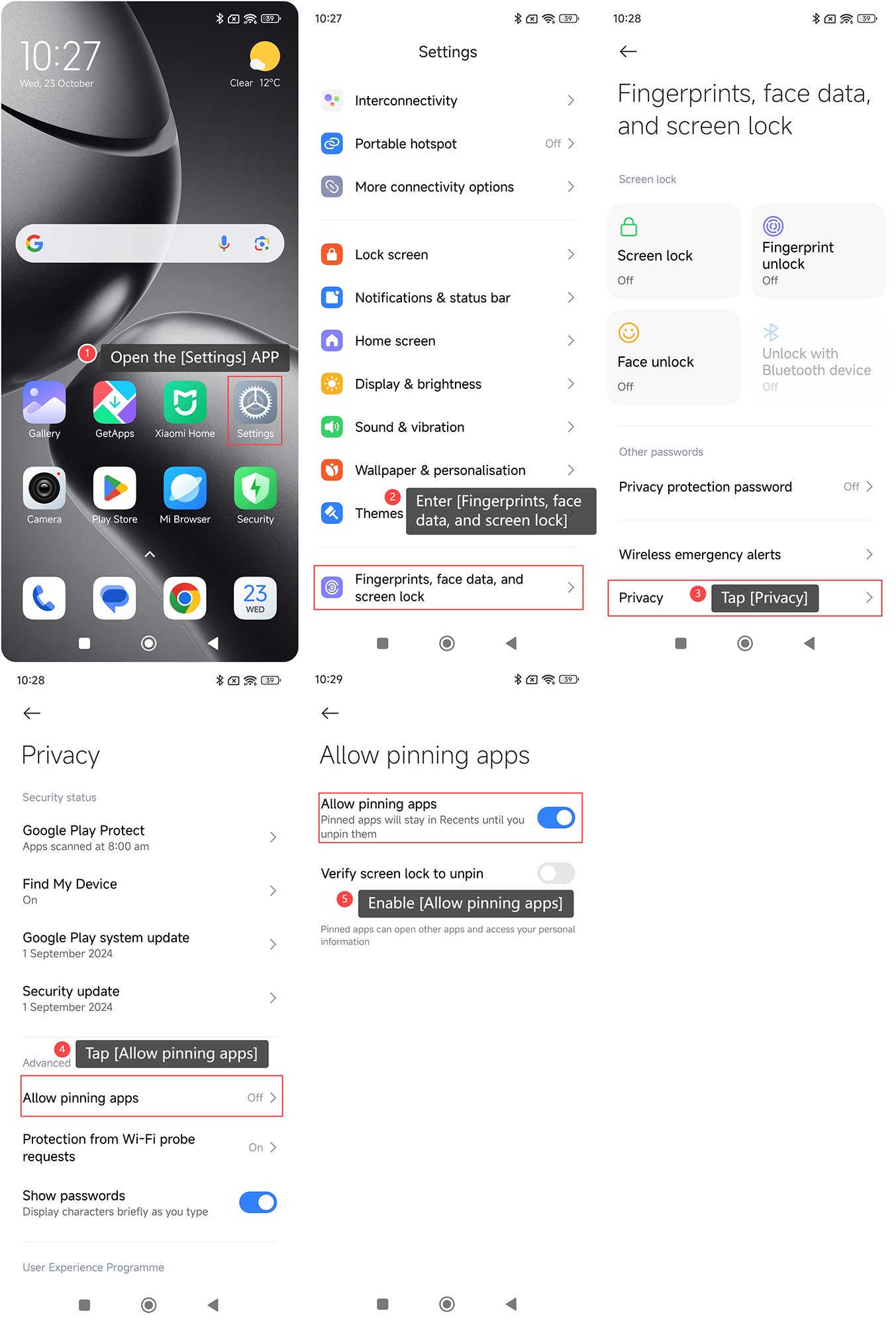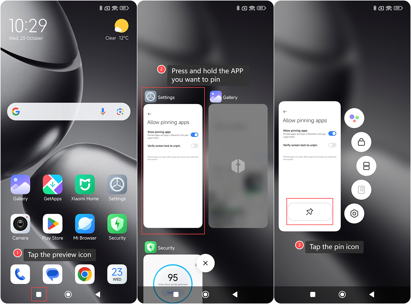 Xiaomi 14T mendukung penyematan APP di Terbaru, yang dapat memuaskan kebiasaan penggunaan APP Anda. APP yang disematkan dapat membuka APP lain dan mengakses informasi pribadi Anda. Jika Anda menyematkan APLIKASI, Anda tidak akan dapat meninggalkan APP sampai Anda melepas sematannya dengan menekan dan menahan kembali dan praview ikon.