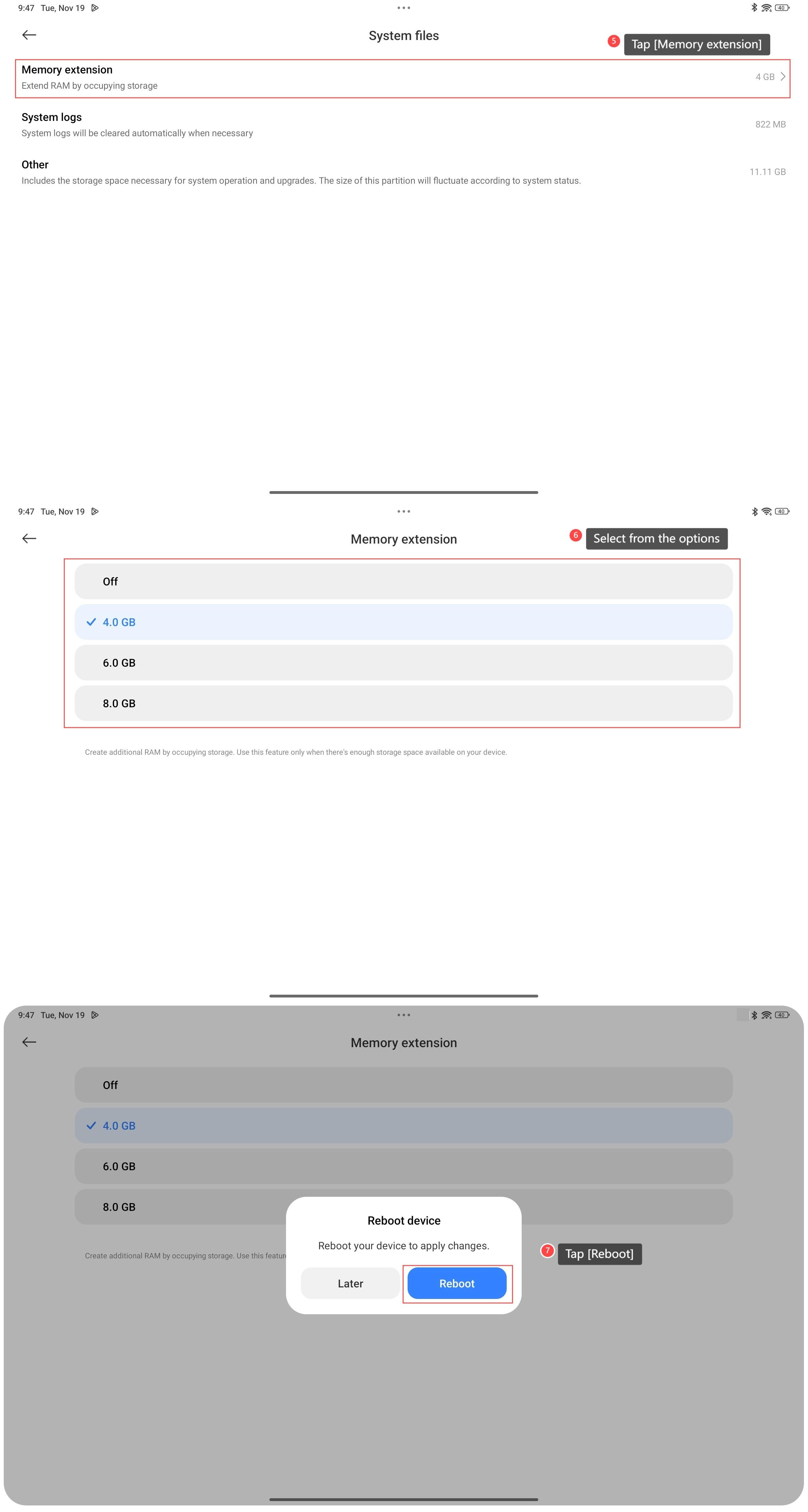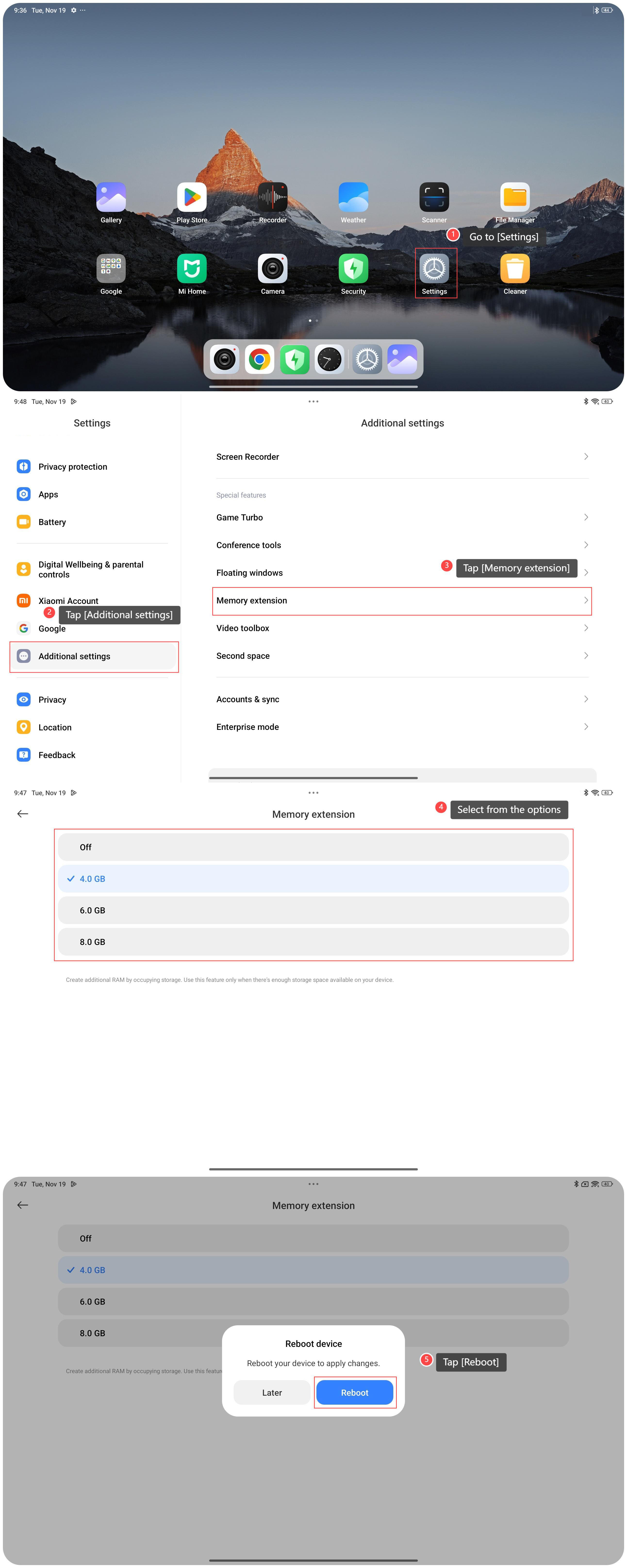 Ekstensi memori adalah fitur bawaan pada REDMI Pad Pro yang memungkinkan pembuatan RAM tambahan dengan menggunakan ruang penyimpanan yang tersedia, memungkinkan perangkat menangani lebih banyak tugas secara bersamaan tanpa melambat. Untuk mengatur ekstensi memori di tablet Anda, silakan lihat metode berikut : Metode 1: 1. Buka [Pengaturan]; 2. Ketuk [Tentang tablet]; 3. Ketuk [Penyimpanan]; 4. Ketuk [File sistem]; 5. Ketuk [Ekstensi memori]; 6. Pilih ukuran yang Anda butuhkan untuk mengalokasikan penyimpanan tambahan untuk RAM virtual; 7. Ketuk [Reboot] untuk menerapkan perubahan. Metode 2: 1. Buka [Pengaturan]; 2. Ketuk [Pengaturantambahan]; 3. Ketuk [Ekstensi memori]; 4. Pilih ukuran yang Anda butuhkan untuk mengalokasikan penyimpanan tambahan untuk RAM virtual; 5. Ketuk [Reboot] untuk menerapkan perubahan. Nota: 1. Gunakan fitur ini hanya jika ada cukup ruang penyimpanan yang tersedia di perangkat Anda. Untuk mengaktifkan opsi ini, Anda memerlukan 10% dari total ruang yang tersisa; 2. Opsi ini akan meningkatkan jumlah RAM yang tersedia, tetapi tidak akan ditampilkan di layar manajemen tugas latar belakang.