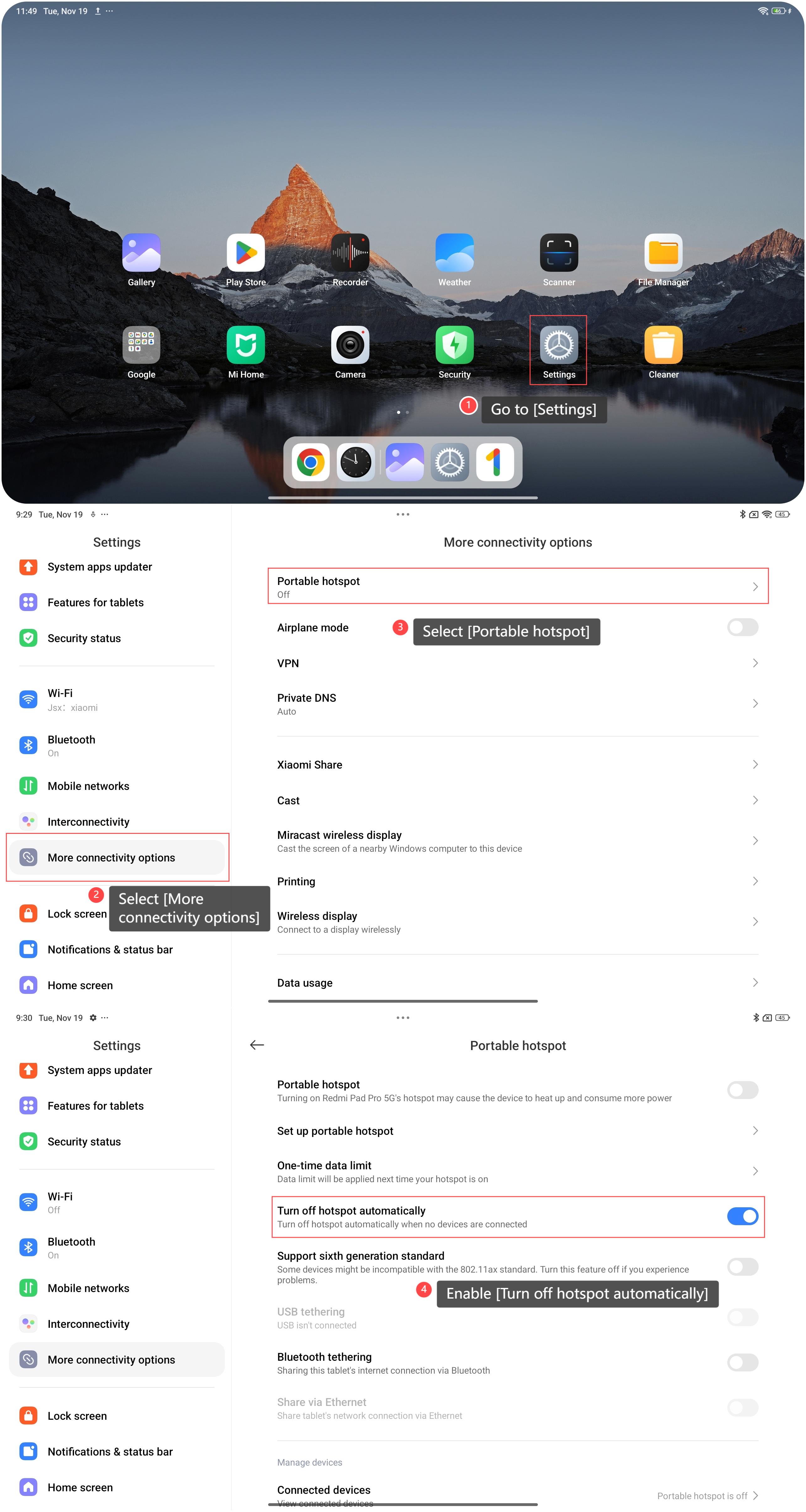 Redmi Pad Pro 5G mendukung fitur bawaan untuk mematikan hotspot secara otomatis saat tidak ada perangkat yang terhubung. Jika Anda lupa mematikan hotspot tepat waktu, fitur ini dapat mematikan hotspot secara otomatis untuk mengurangi penggunaan jaringan.