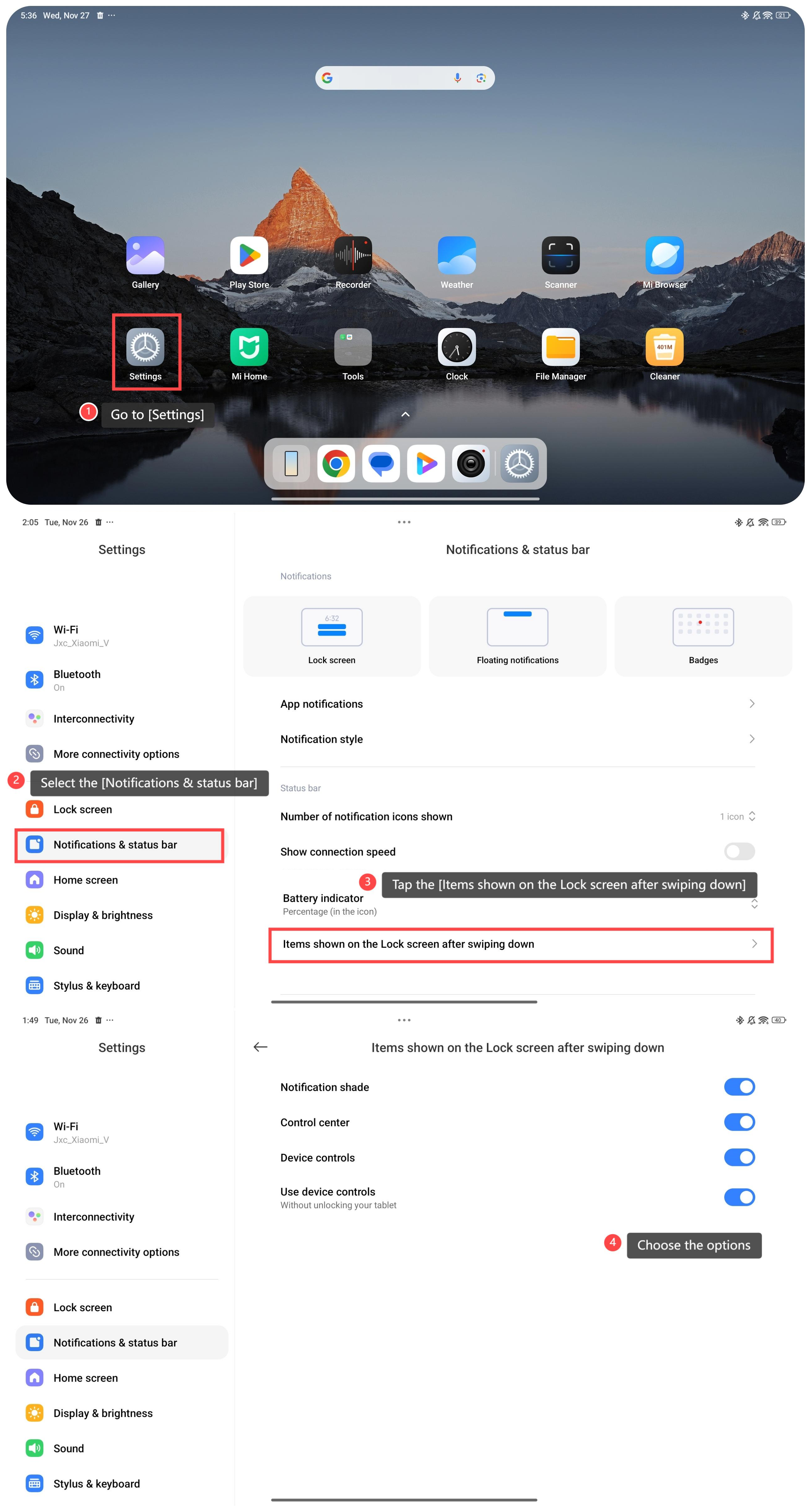 Redmi Pad Pro, mengatur item yang ditampilkan di layar kunci setelah menggesek ke bawah melibatkan penyesuaian menu akses cepat yang muncul saat Anda menggesek ke bawah dari atas layar saat tablet Anda terkunci.