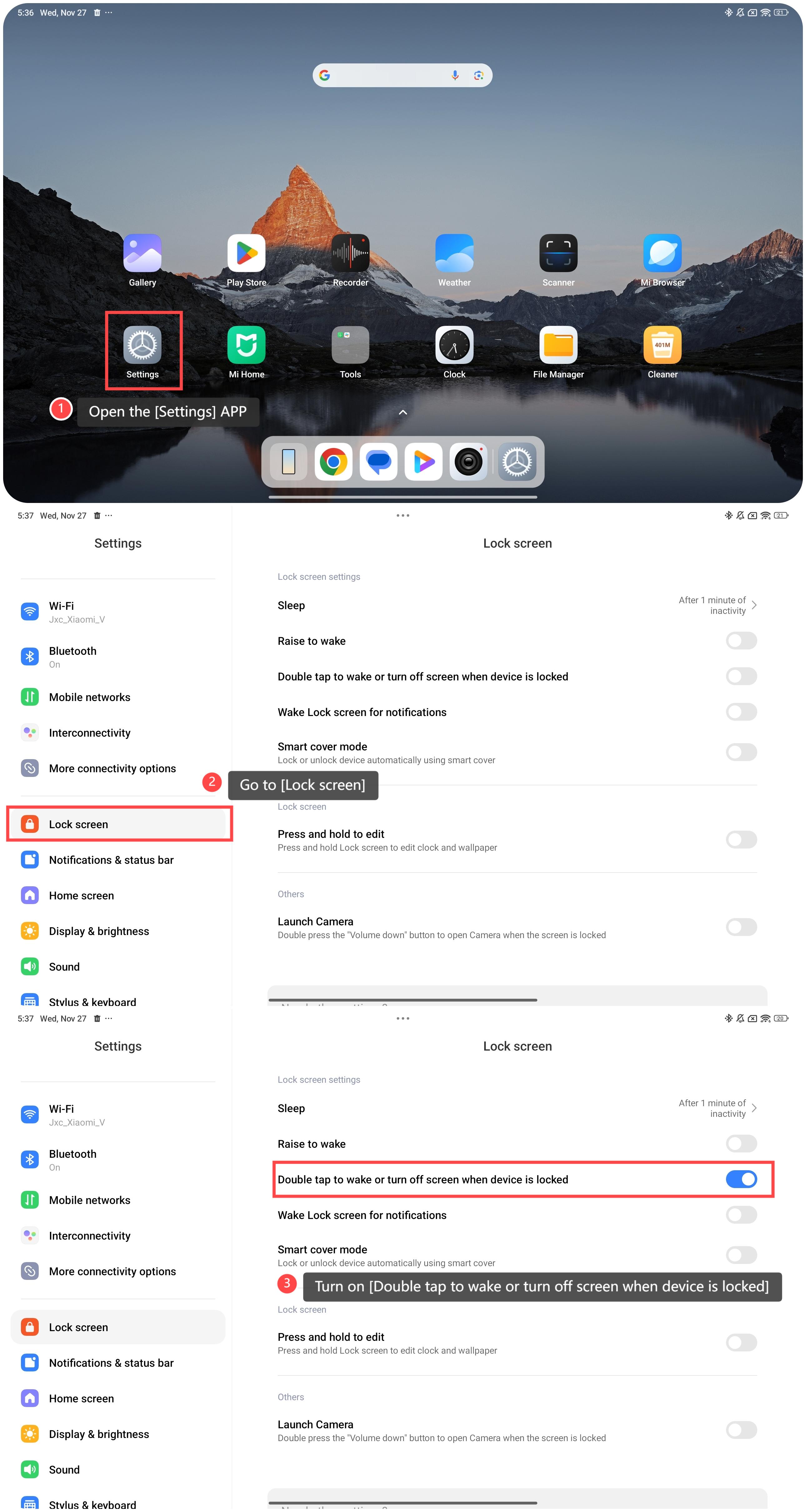 1. Bangunkan tablet dengan mengetuk dua kali layar, sehingga mudah untuk memeriksa notifikasi, waktu, atau tugas yang sedang berlangsung tanpa mencari tombol daya;