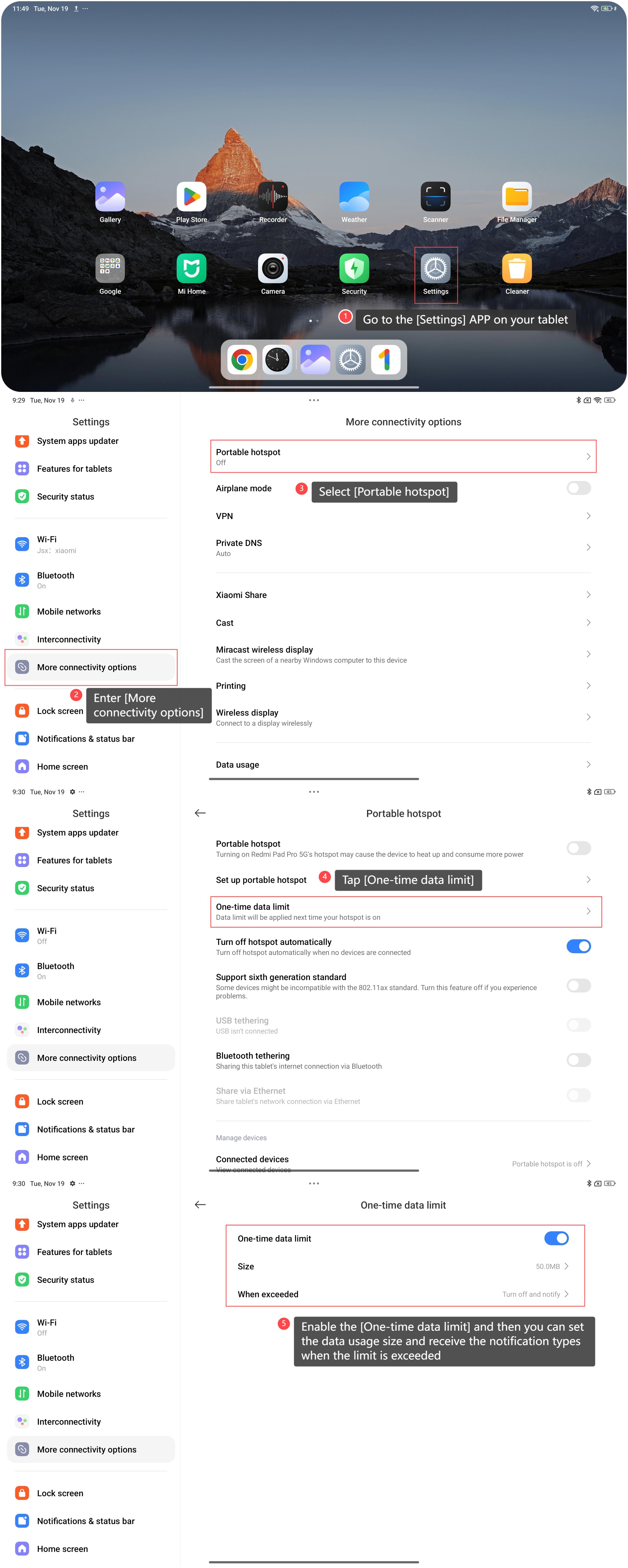 Untuk mengatur batas data untuk hotspot Anda di tablet, silakan lihat langkah-langkah berikut: