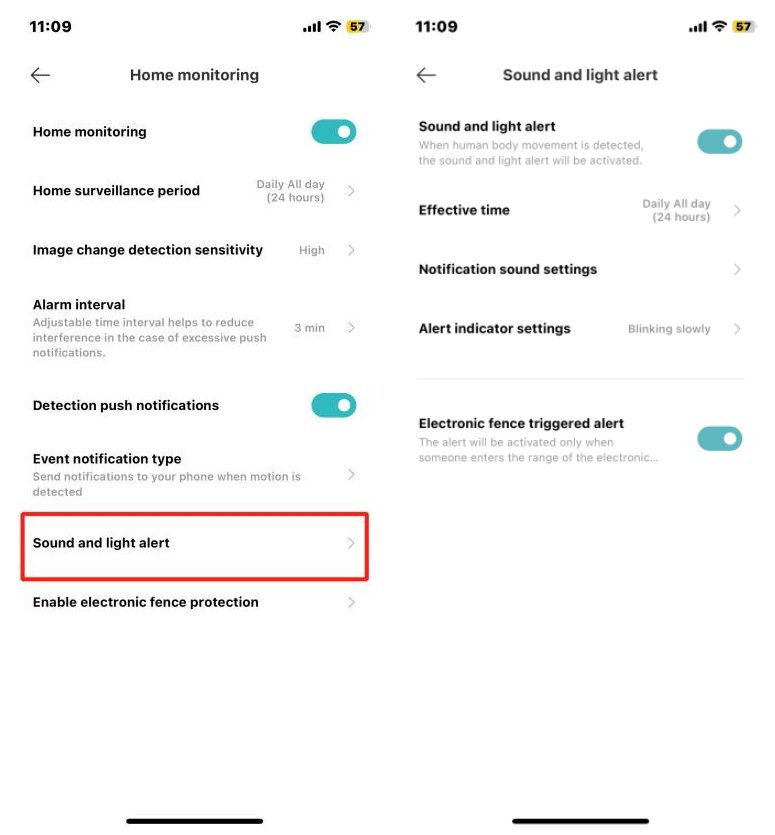 Xiaomi Outdoor Camera AW300 memiliki fungsi peringatan suara dan cahaya, yang dinonaktifkan secara default. Setelah mengaktifkan fitur ini, ketika kamera mendeteksi ada gerakan manusia, kamera akan membuat peringatan suara dan cahaya. Anda dapat memilih waktu efektif, pengaturan suara notifikasi, dan pengaturan indikator peringatan.
