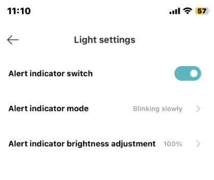 11. Ketuk [Pengaturan indikator peringatan] dan nyalakan [Sakelar indikator peringatan]. Anda juga dapat mengatur [Mode indikator peringatan] dan [Penyesuaian kecerahan indikator peringatan] di antarmuka ini. Secara default, saat Anda mengaktifkan peringatan suara dan cahaya, peringatan cahaya juga diaktifkan dengan berkedip dan kecerahan 100%. Anda dapat mengatur mode indikator peringatan ke [Selalu aktif], [Berkedip perlahan], atau [Berkedip cepat]. Sesuaikan kecerahan dari 1 hingga 100 level;