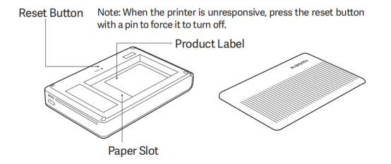Selain itu, ada tombol reset, label produk, dan slot kertas di printer. Saat printer tidak responsif, Anda dapat menekan tombol reset dengan pin untuk memaksanya mati.