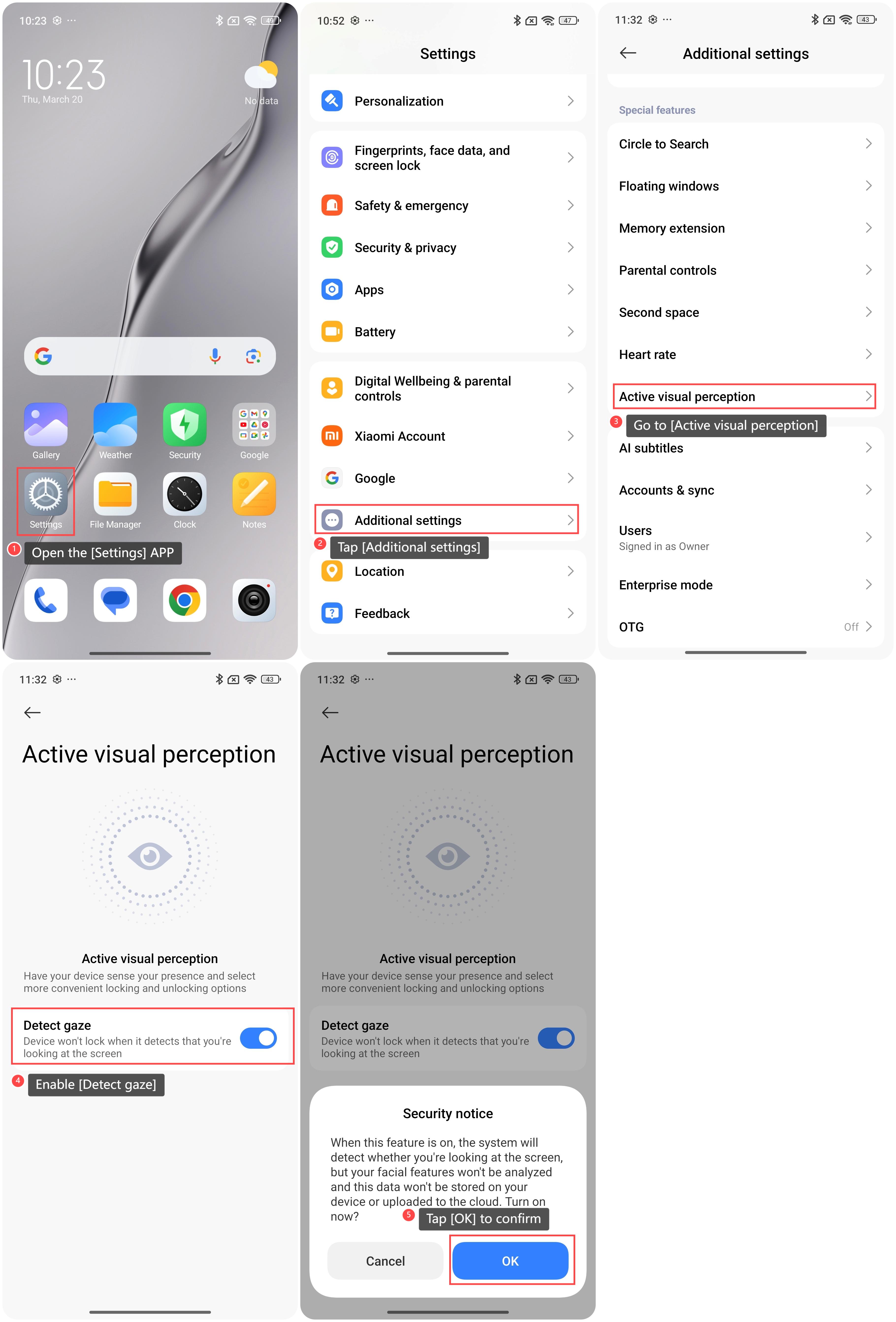 Smartphone Xiaomi mendukung fungsi Deteksi tatapan. Saat Anda menyalakan Deteksi tatapan, perangkat tidak akan terkunci saat mendeteksi bahwa Anda sedang melihat layar. Karakteristik wajah Anda tidak akan dianalisis, dan informasi wajah Anda tidak akan disimpan di perangkat atau diunggah ke cloud.