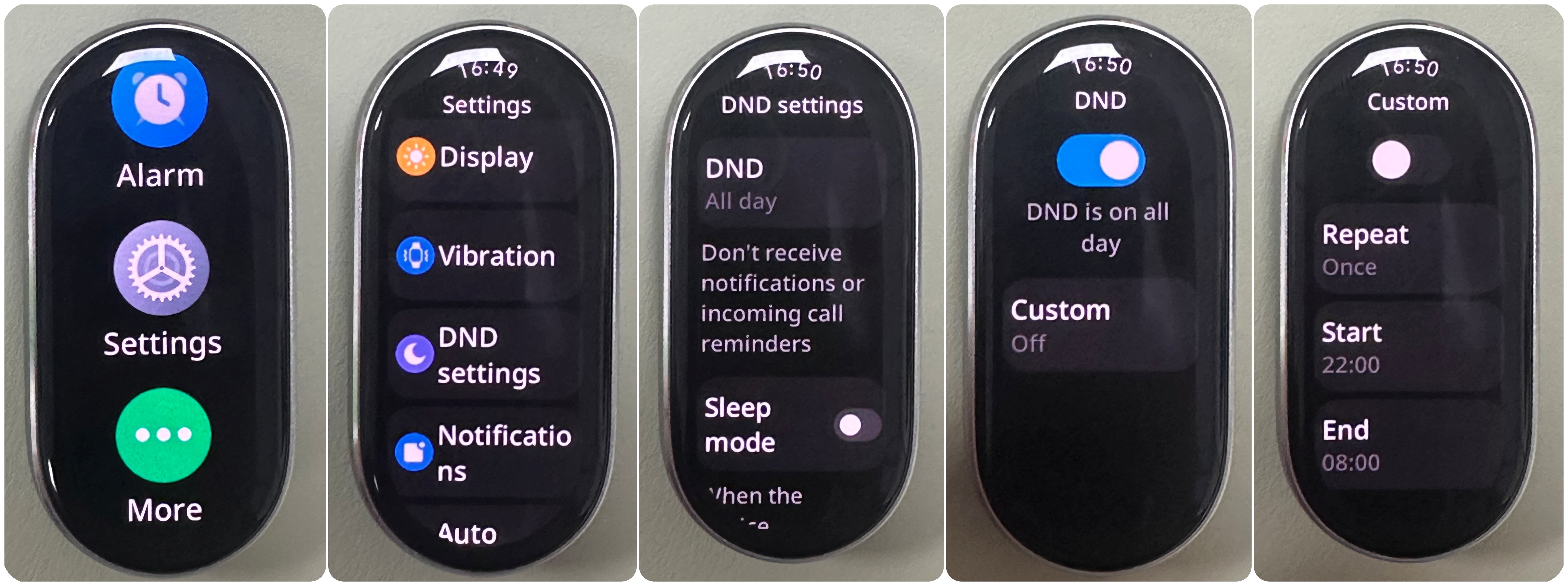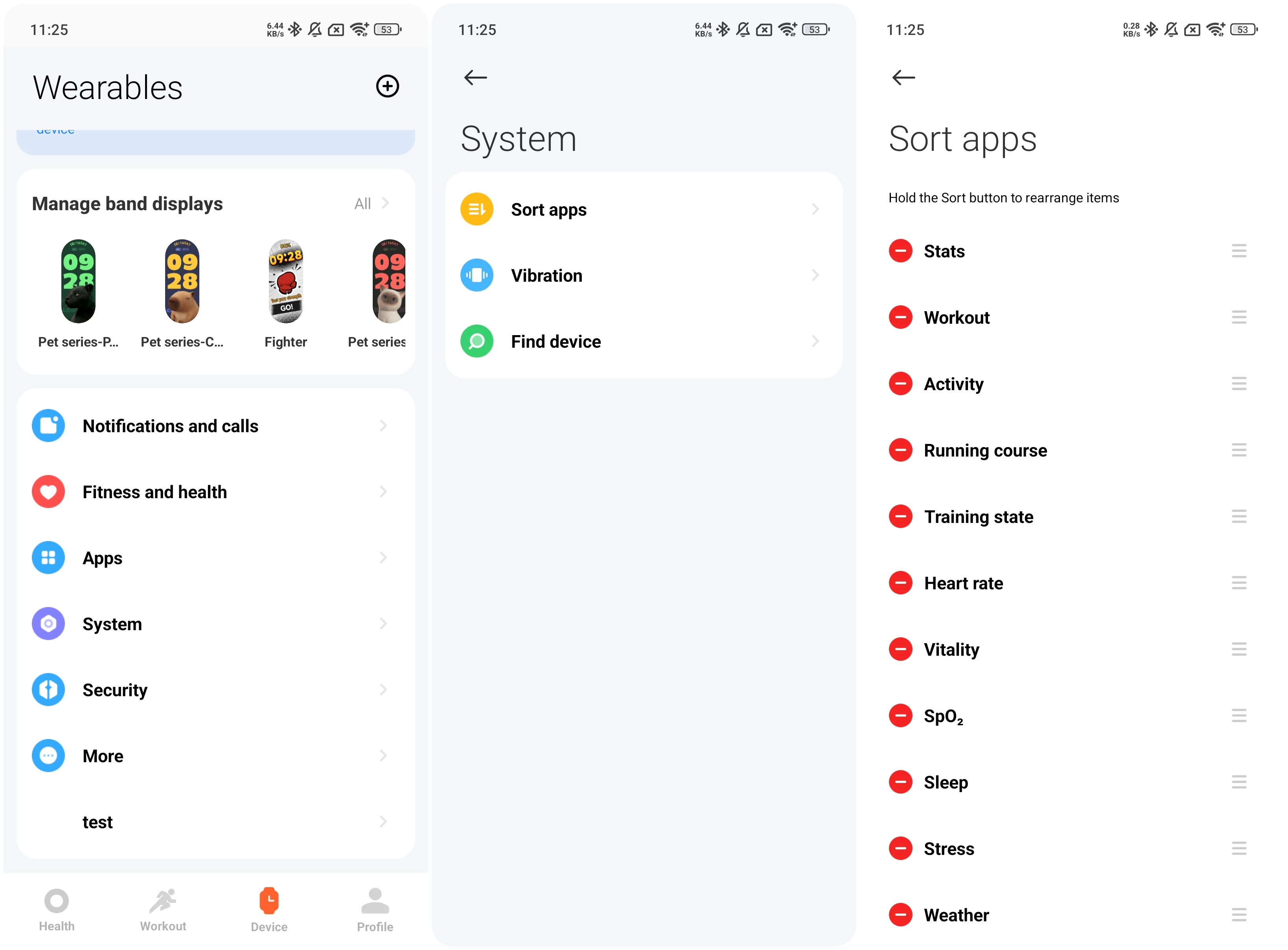 Statistik, Latihan, Riwayat, Kursus lari, Status latihan, Detak jantung, Skor vitalitas, SpO₂, Tidur, Stres, Cuaca, Kalender, Alarm, Xiaomi Smart Hub, Pengaturan, dan banyak lagi.