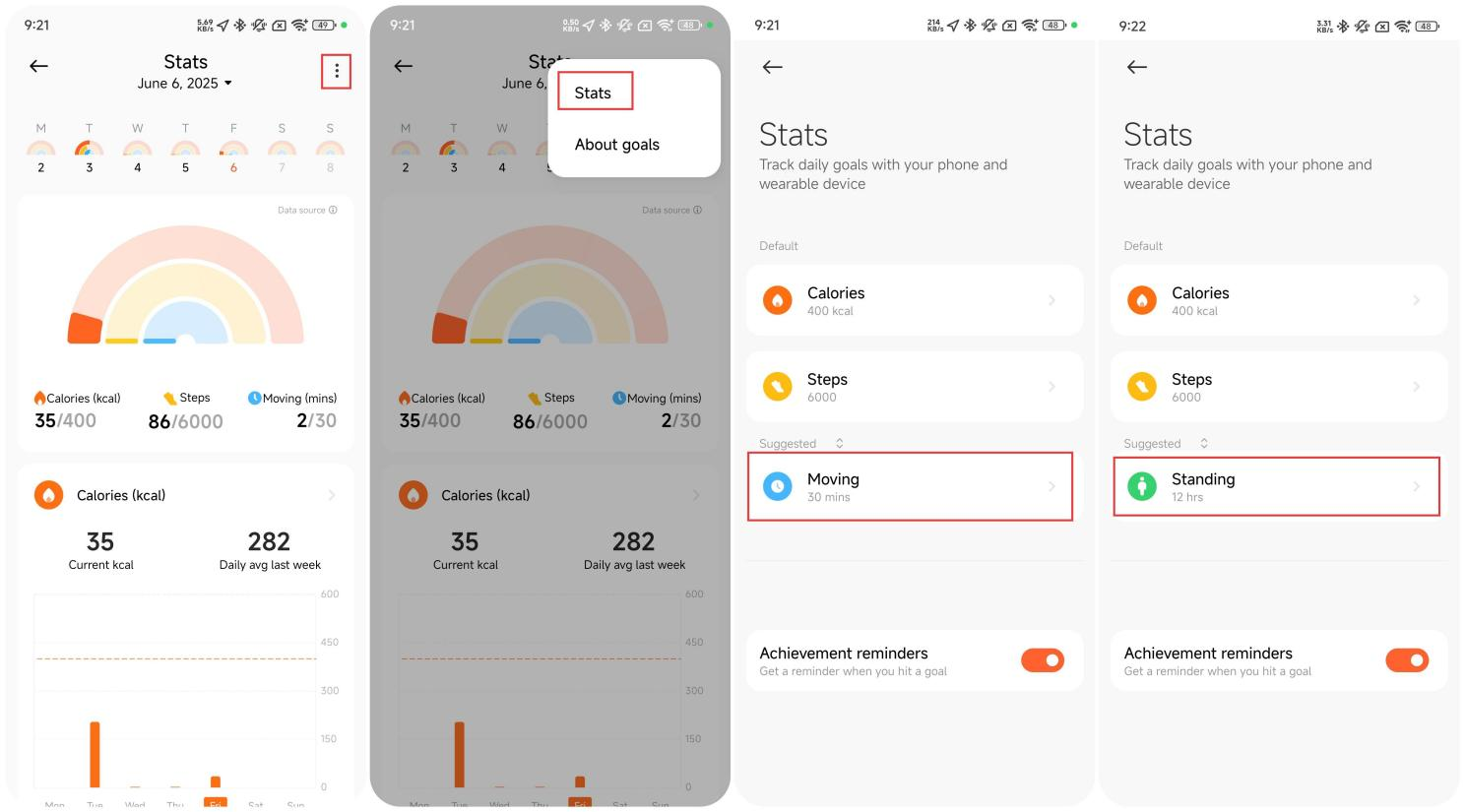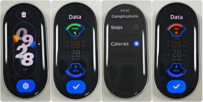 8. Smart band juga menampilkan metrik vitalitas termasuk kalori, langkah, berdiri, dan bergerak (pilih tiga untuk ditampilkan). Anda dapat dengan mudah melacak tujuan harian dan kemajuan melalui Statistik.