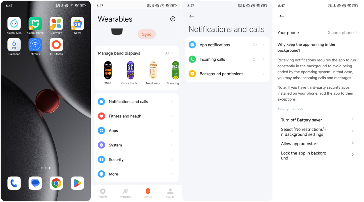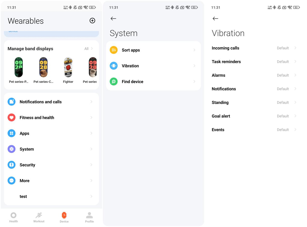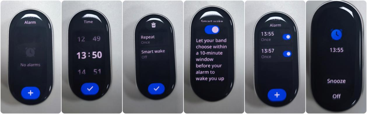 Statistik, Latihan, Riwayat, Kursus lari, Status latihan, Detak jantung, Skor vitalitas, SpO₂, Tidur, Stres, Cuaca, Kalender, Alarm, Xiaomi Smart Hub, Pengaturan, dan banyak lagi.
