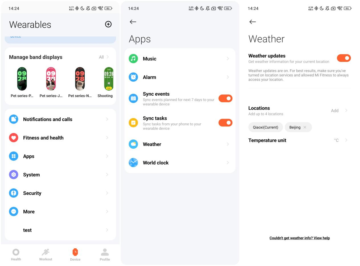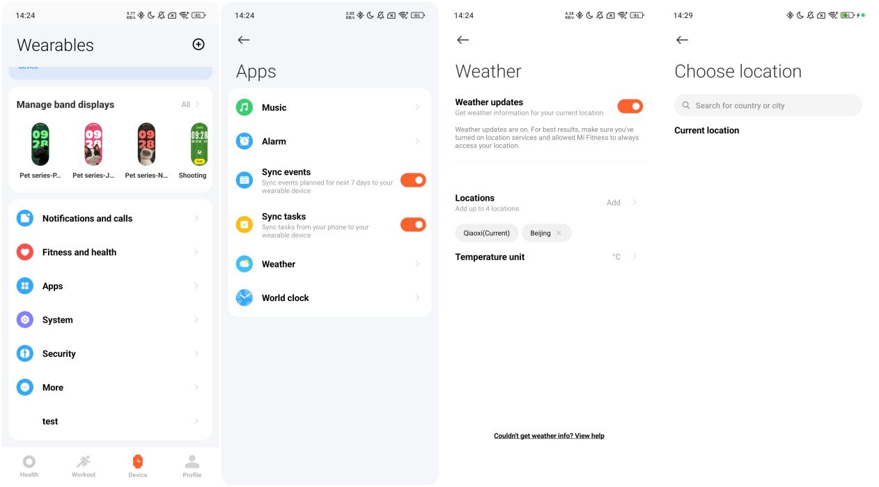 1. Ponsel Android: Masuk ke Aplikasi Mi Fitness >>[Perangkat] >> [Apps] >> [Cuaca], dan segarkan setelah memasuki atau ketuk kota untuk memposisikan ulang;