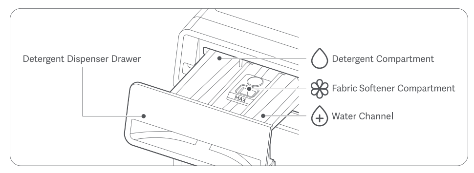 2. Tambahkan deterjen ke dalam Kompartemen Deterjen. Lihat petunjuk penggunaan deterjen dan tambahkan sebagaimana mestinya;