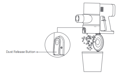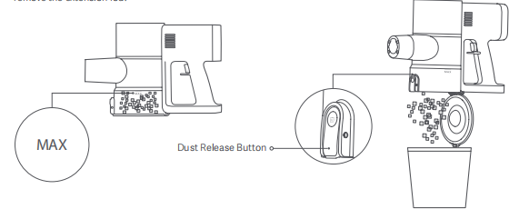 Sebelum membersihkan Kompartemen Debu, harap konfirmasikan bahwa adaptor daya terputus dan lepaskan Batang Ekstensi. Ketika debu mencapai tanda maksimum, terus menggunakan akan mempengaruhi efek vakum. Harap bersihkan sesegera mungkin sebelum digunakan.