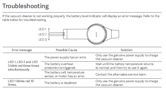 Jika LED 1 berkedip merah 10 kali menunjukkan bahwa baterai habis, gunakan catu daya asli untuk mengisi daya penyedot debu.