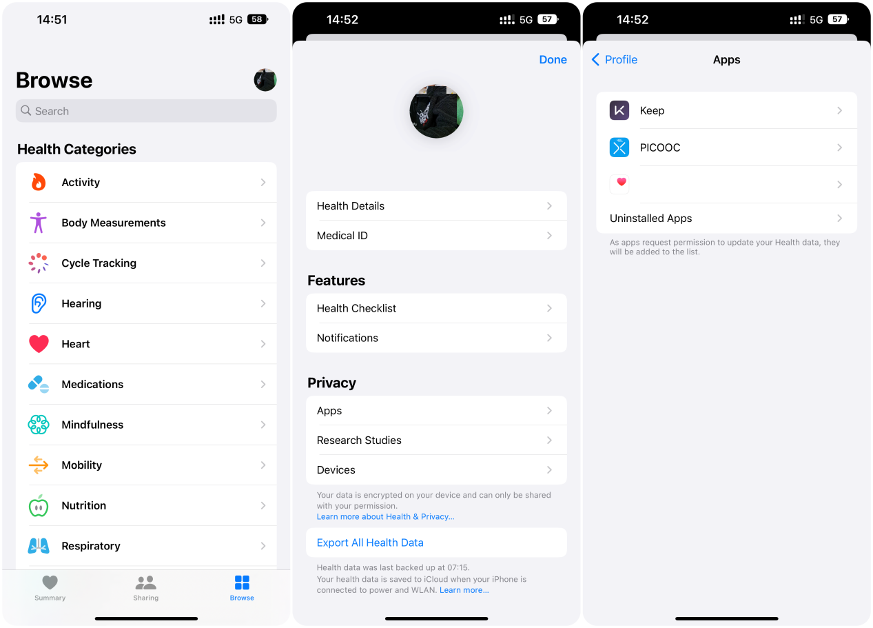 2. Buka APLIKASI Kesehatan >> pilih [Telusuri] >> ketuk lingkaran kecil di sudut kanan atas >> ketuk [Aplikasi] >> [Mi Fitness] >> pilih item data yang ingin Anda sinkronkan;