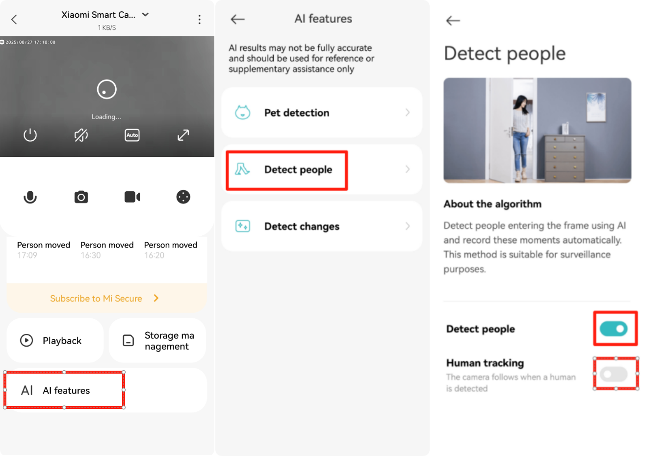 Silakan periksa apakah fitur pelacakan manusia dan pelacakan hewan peliharaan diaktifkan. Anda dapat memeriksanya di jalur berikut: Buka Aplikasi Xiaomi Home >> pilih Xiaomi Smart Camera C201 >> ketuk [fitur AI] >> nonaktifkan fungsi pelacakan baik dalam deteksi manusia atau deteksi hewan peliharaan.