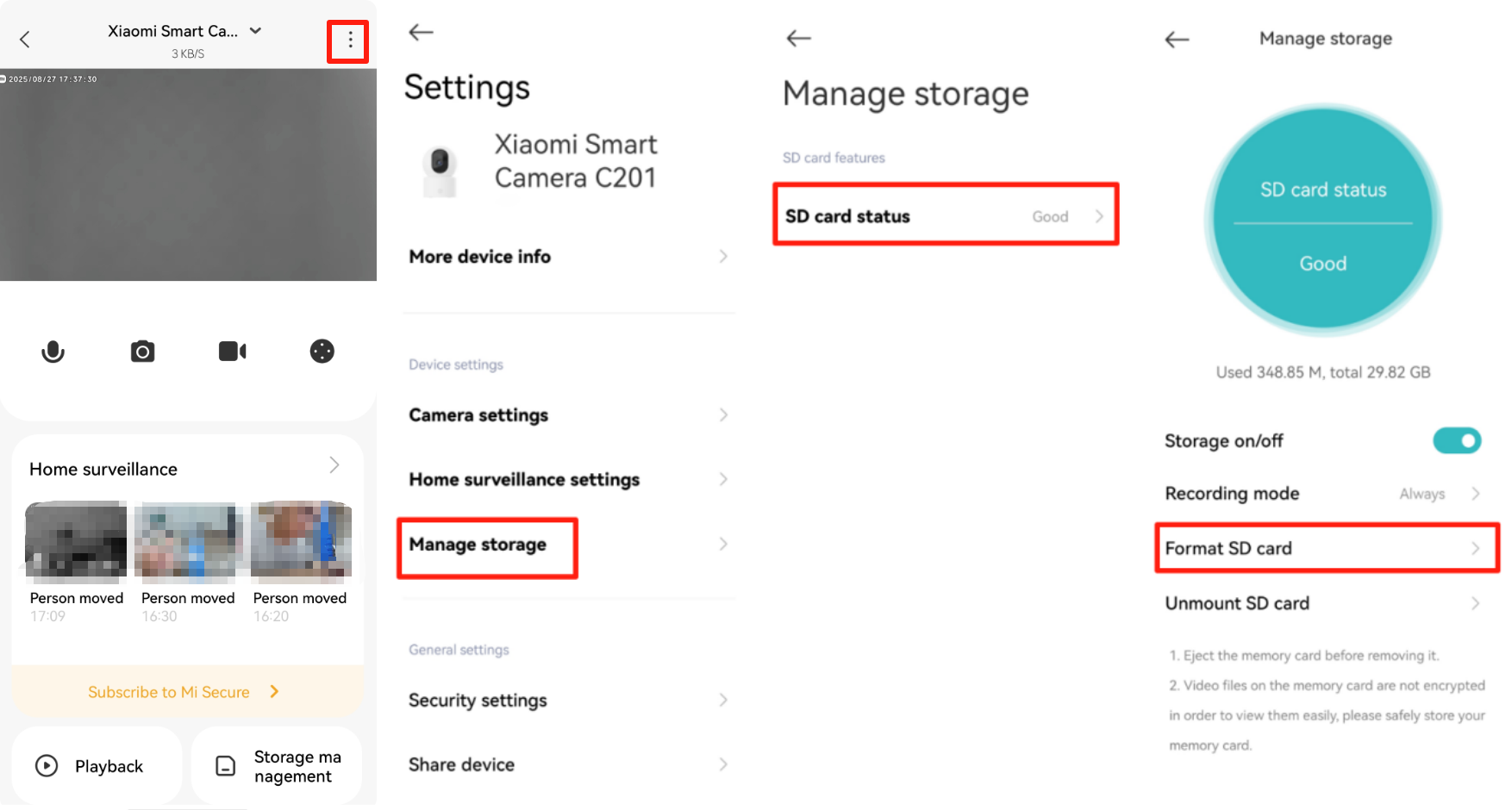 Format kartu microSD di dalam Aplikasi Xiaomi Home. Memformat kartu microSD akan menghapus video. Anda dapat mencadangkan video sebelum memformat.