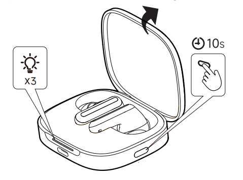 Coba atur ulang earbud. Tempatkan kedua earbud di wadah pengisi daya. Jaga agar tutup casing tetap terbuka. Tekan dan tahan tombol di bagian bawah wadah pengisi daya selama 10 detik hingga indikator putih pada wadah pengisi daya memasuki keadaan berkedip cepat, yang berarti reset berhasil. Setelah mengatur ulang, earbud akan masuk ke mode berpasangan secara otomatis, lalu sambungkan kembali ke telepon.