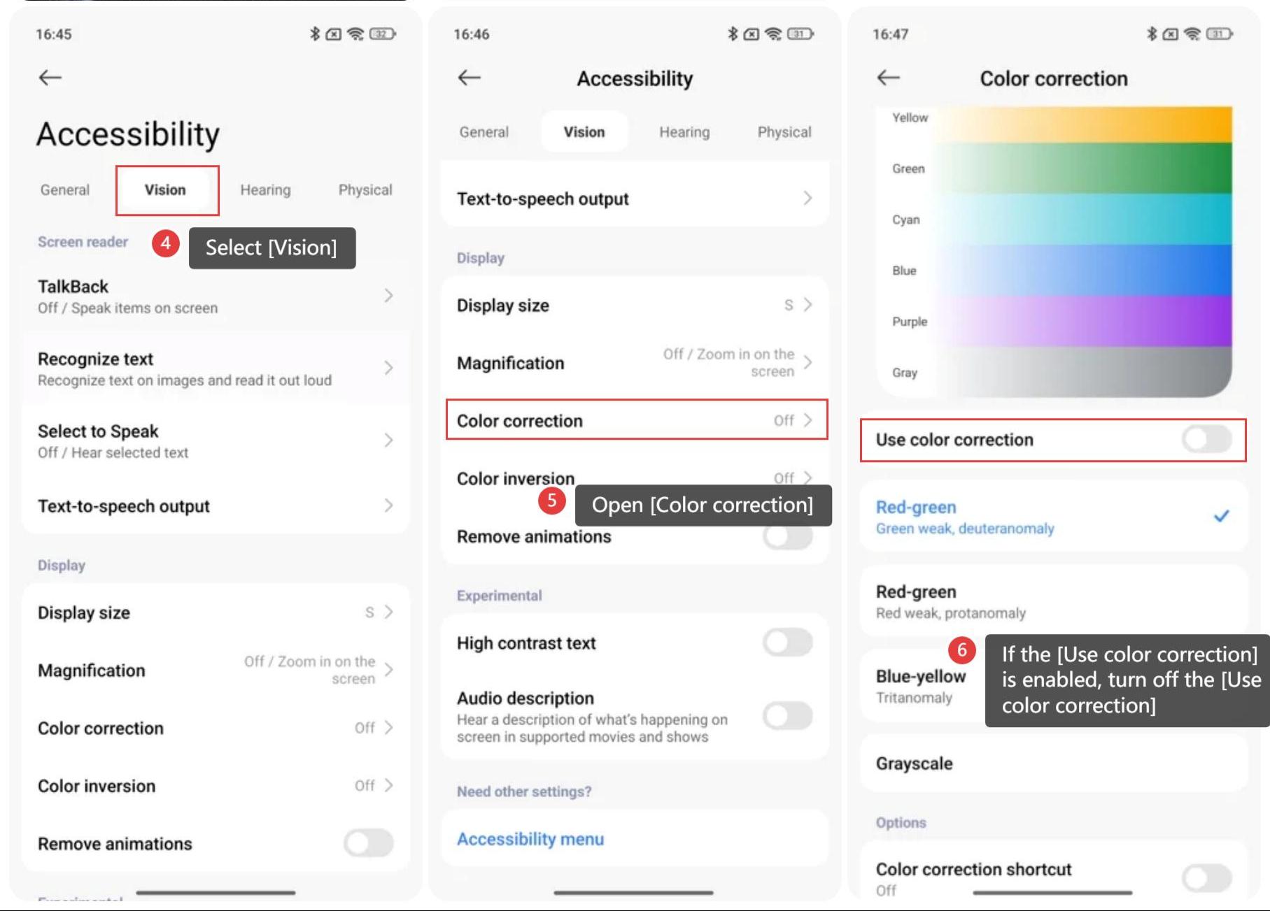 Buka [Koreksi warna] dan periksa apakah [Skala abu-abu] dipilih.