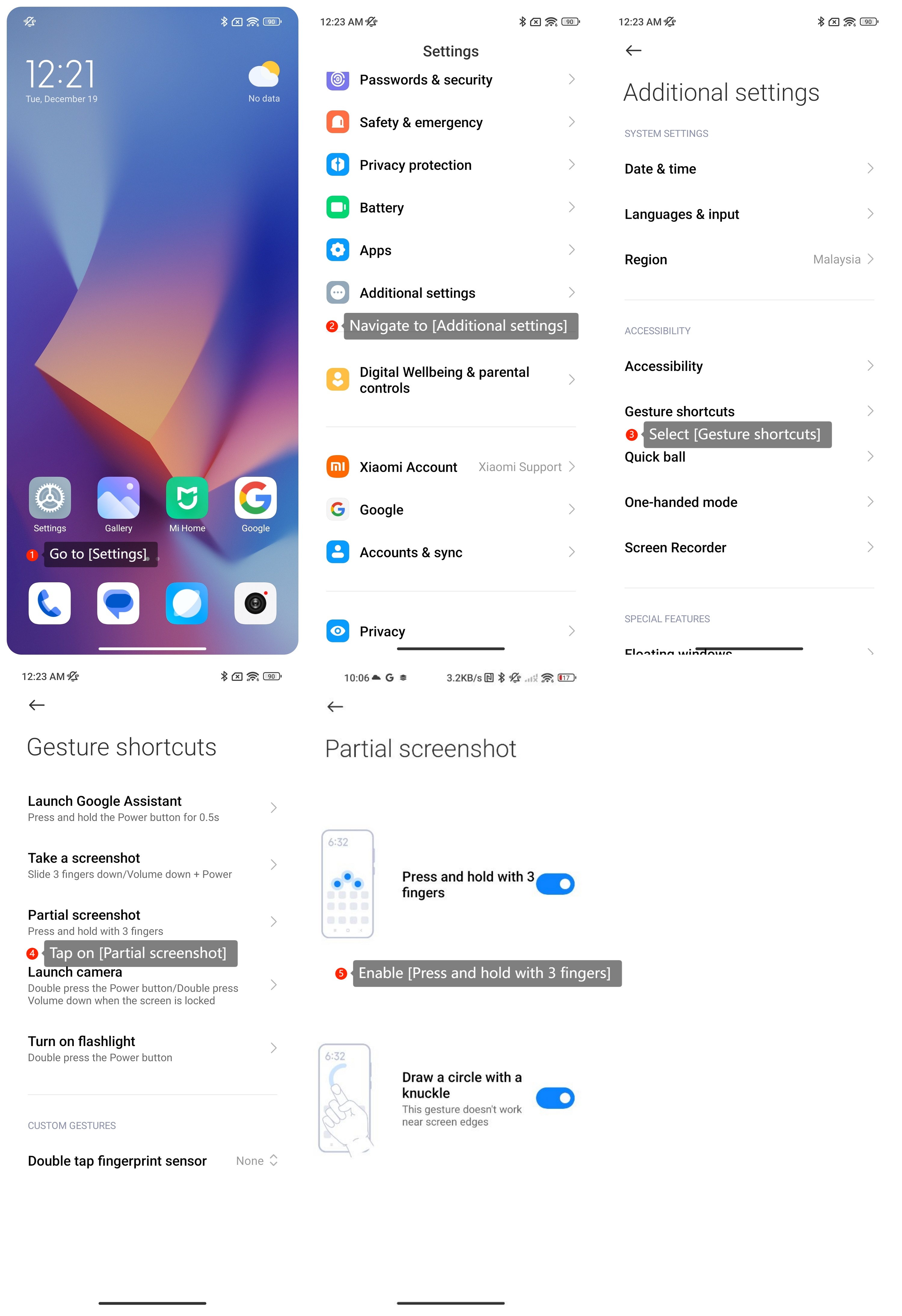 (2). Anda juga dapat mengaktifkan pintasan ini dengan membuka [Pengaturan] >> [Pengaturan tambahan] >> [Pintasan gerakan] >> [Tangkapan layar sebagian] >> [Gambar lingkaran dengan buku jari].