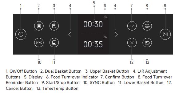 Fungsi sinkronisasi satu sentuhan: Piring dan lauk pauk dapat disiapkan secara bersamaan. Jika Anda ingin mengatur pengaturan yang berbeda untuk setiap keranjang, tekan tombol "Sinkronkan" dan pilih suhu dan durasi untuk setiap keranjang. Kedua keranjang akan diatur pada saat yang sama.