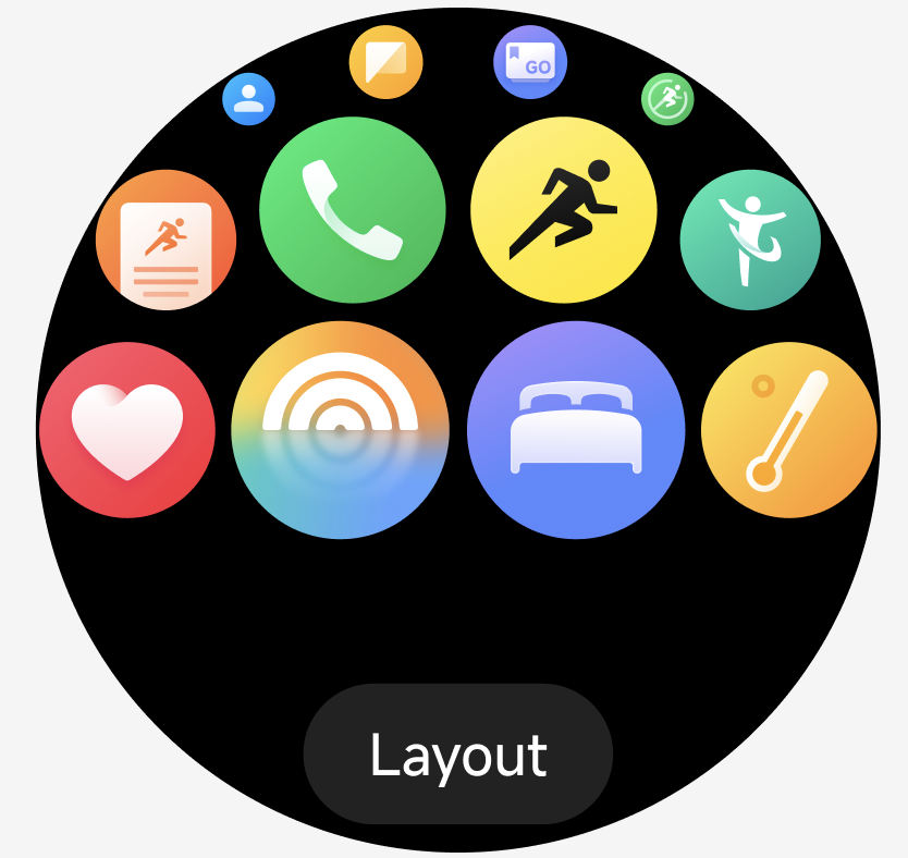 1. Di jam tangan: Tekan kenop yang berputar untuk mengakses daftar Aplikasi >> geser ke atas atau ke bawah layar atau putar kenop ke bawah >> pilih [Tata Letak] untuk beralih. Atau, tekan kenop yang berputar >> masuk ke [Pengaturan] >> [Layar Beranda] >> ketuk [Tata Letak] untuk beralih.