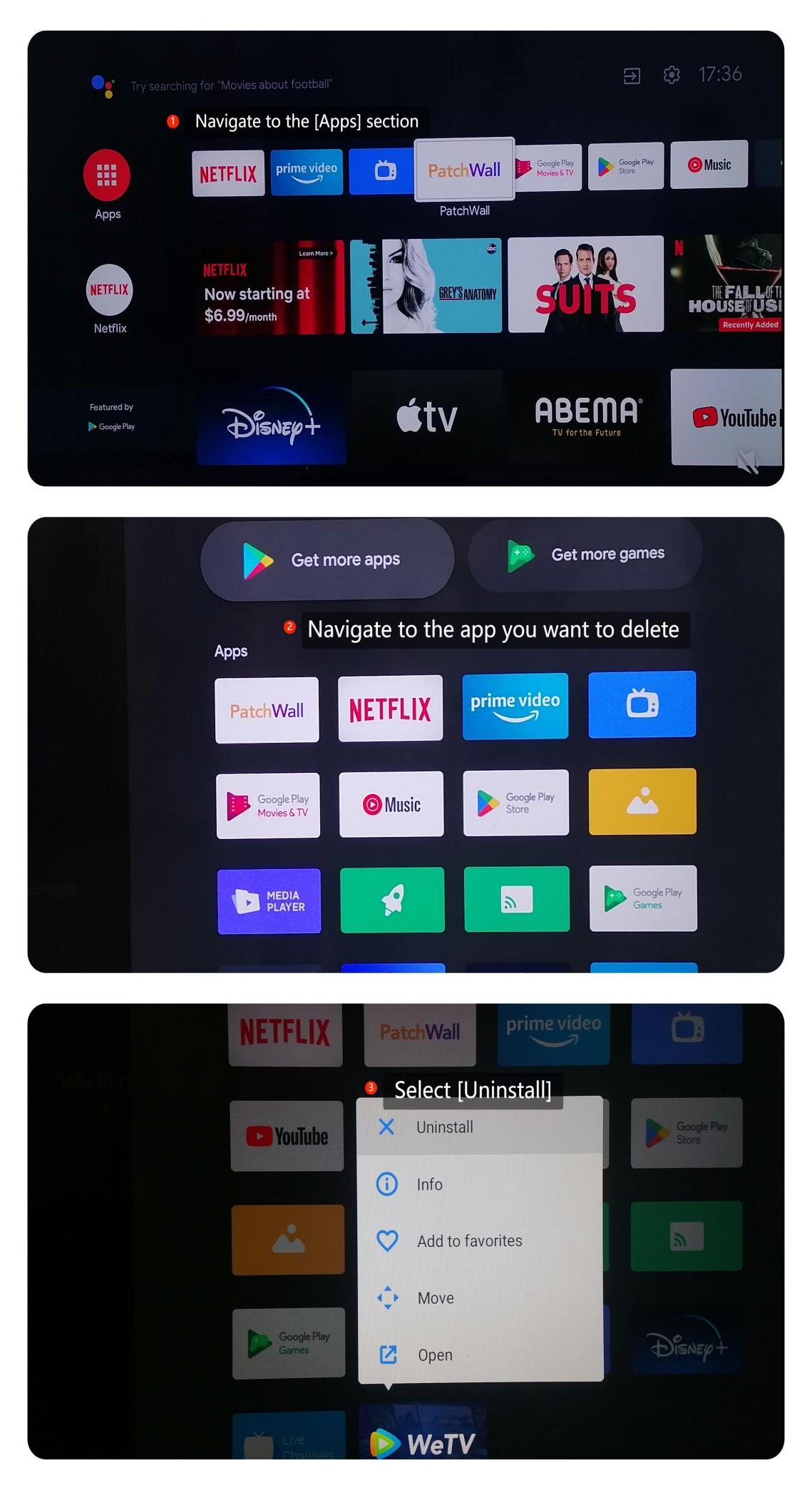Menghapus Saluran: 1. Tekan tombol Beranda >>Arahkan ke bagian [Aplikasi] >> Arahkan ke aplikasi yang ingin Anda hapus. 2. Pada aplikasi yang ingin Anda hapus, tekan dan tahan tombol [OK] pada remote control Anda. 3. Sebuah menu akan muncul dengan opsi. Pilih [Uninstall].
