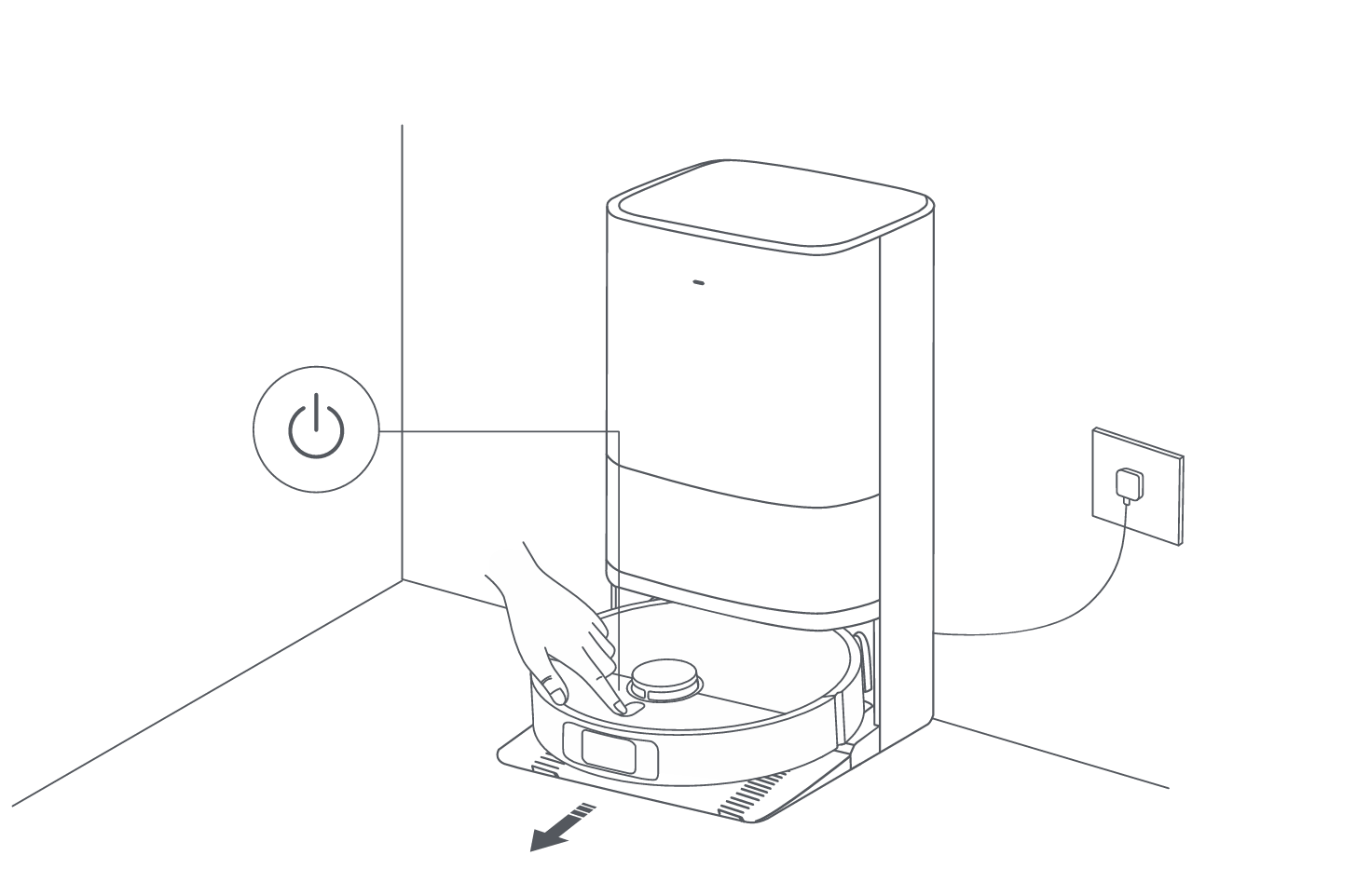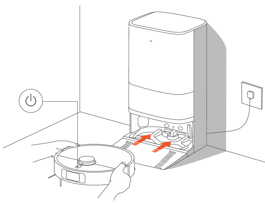 4. Sebelum digunakan, tekan dan tahan tombol daya pada penyedot debu robot selama 3 detik untuk menyalakannya. Setelah penyedot debu robot menyala, letakkan di stasiun omni, dan pastikan kontak pengisian daya pada penyedot debu robot dan stasiun sejajar sepenuhnya. Penyedot debu robot berhasil terhubung ke omni station saat Anda mendengar perintah suara untuk mulai mengisi daya.