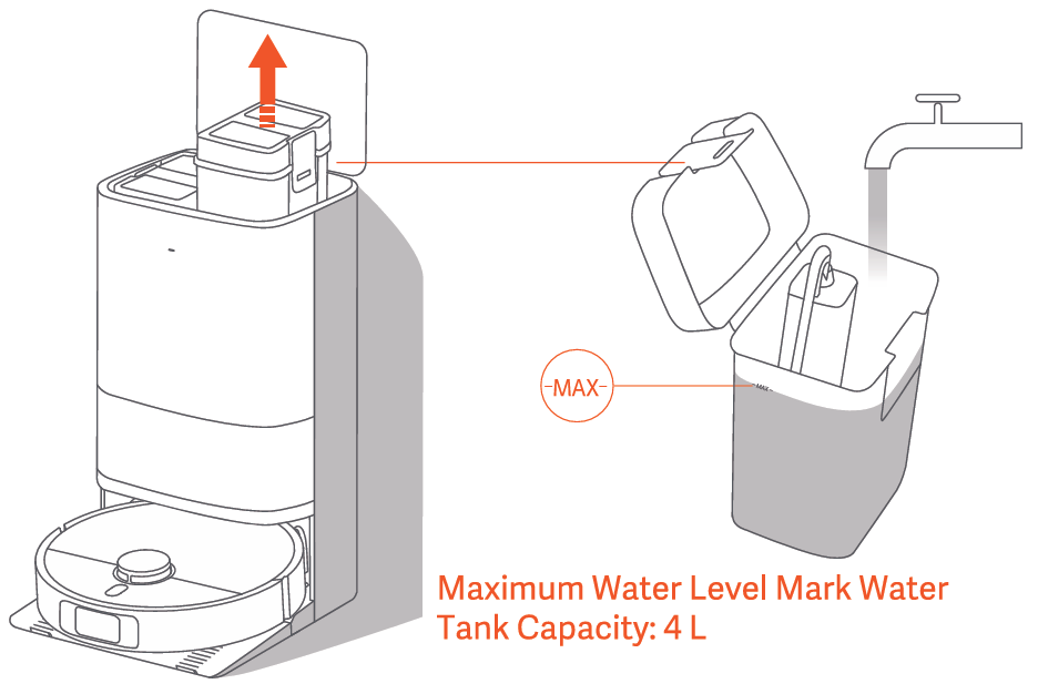 2. Jangan melebihi ketinggian air maksimum saat menyuntikkan air. Jangan mengisi air panas, karena akan menyebabkan deformasi tangki air. Pembersih lantai elemen harian perlu dibeli secara terpisah dari saluran resmi. Rasio pembersih terhadap air adalah 1:100. Jangan mengocok dengan kuat setelah menambahkan pembersih.