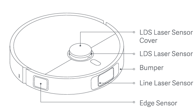 3. Periksa dan bersihkan benda asing, rambut, dan kotoran yang telah masuk ke sensor laser LDS. Bersihkan lensa hitam di bagian depan dan samping penyedot debu robot untuk memeriksa keausan.