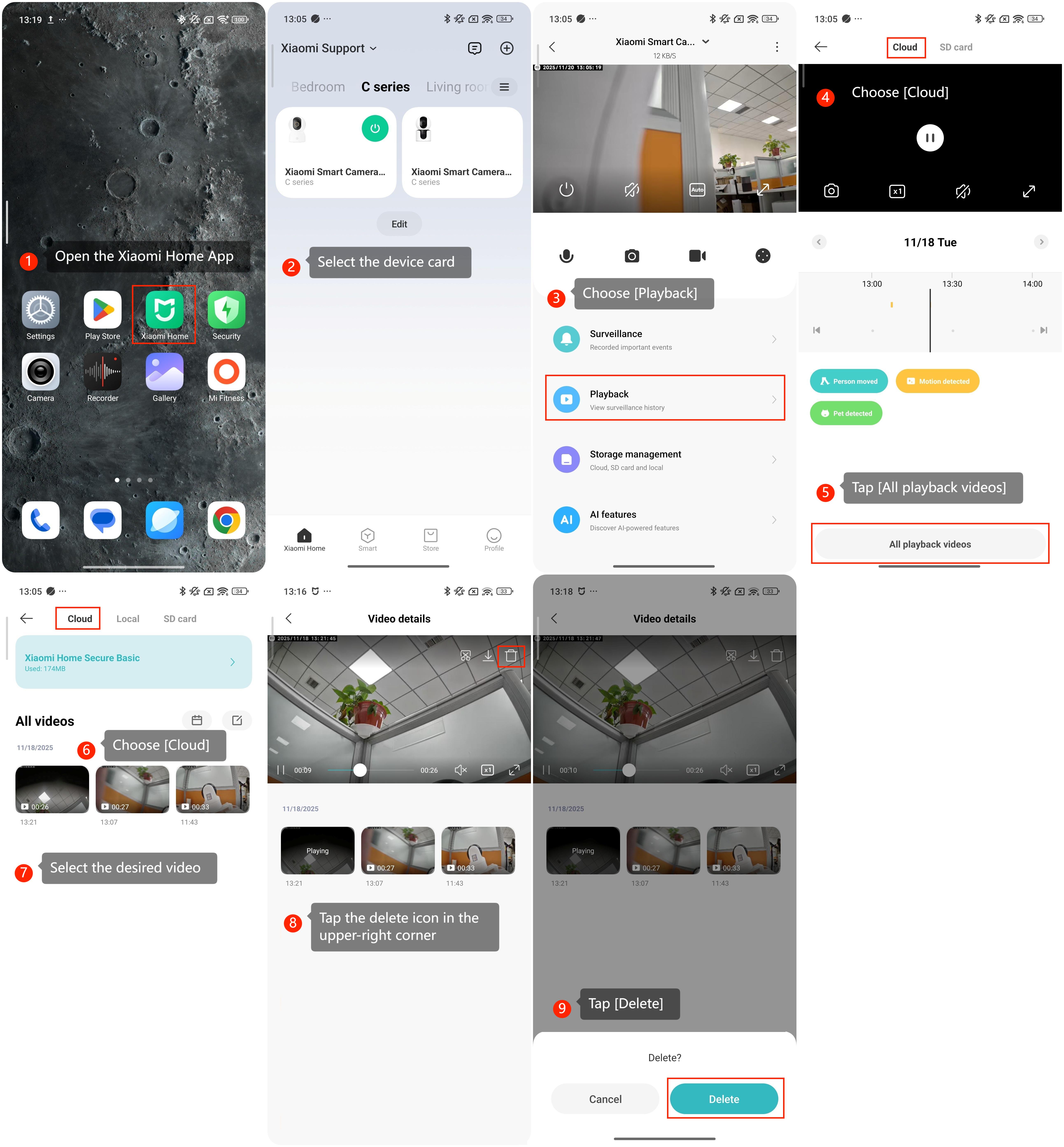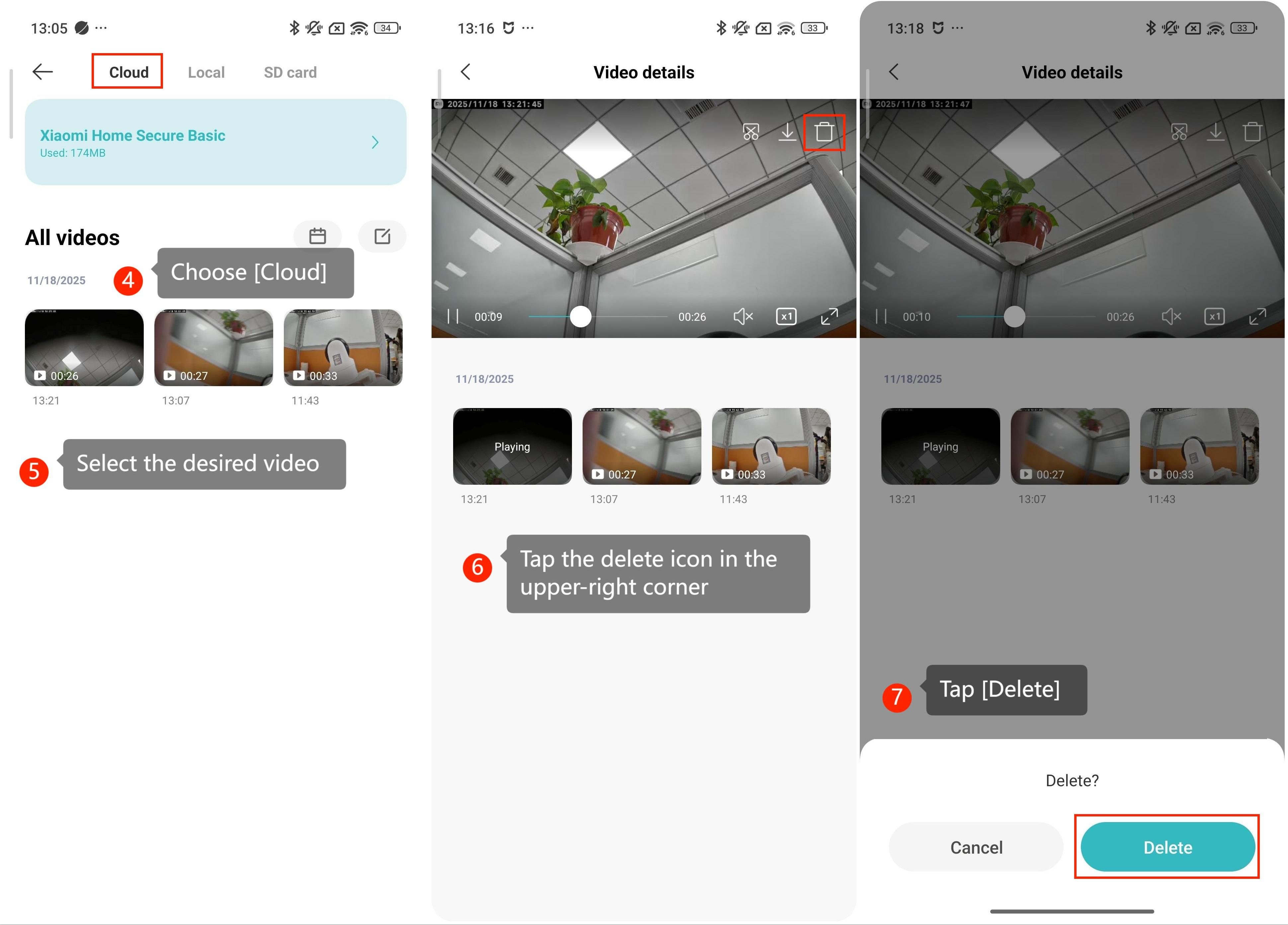 Video yang direkam oleh Xiaomi Home Secure dapat dihapus langsung melalui Aplikasi Xiaomi Home. Ini memungkinkan Anda untuk menghapus rekaman yang tidak diinginkan atau kedaluwarsa dari cloud, mengosongkan penyimpanan dan menjaga perpustakaan video Anda tetap teratur.