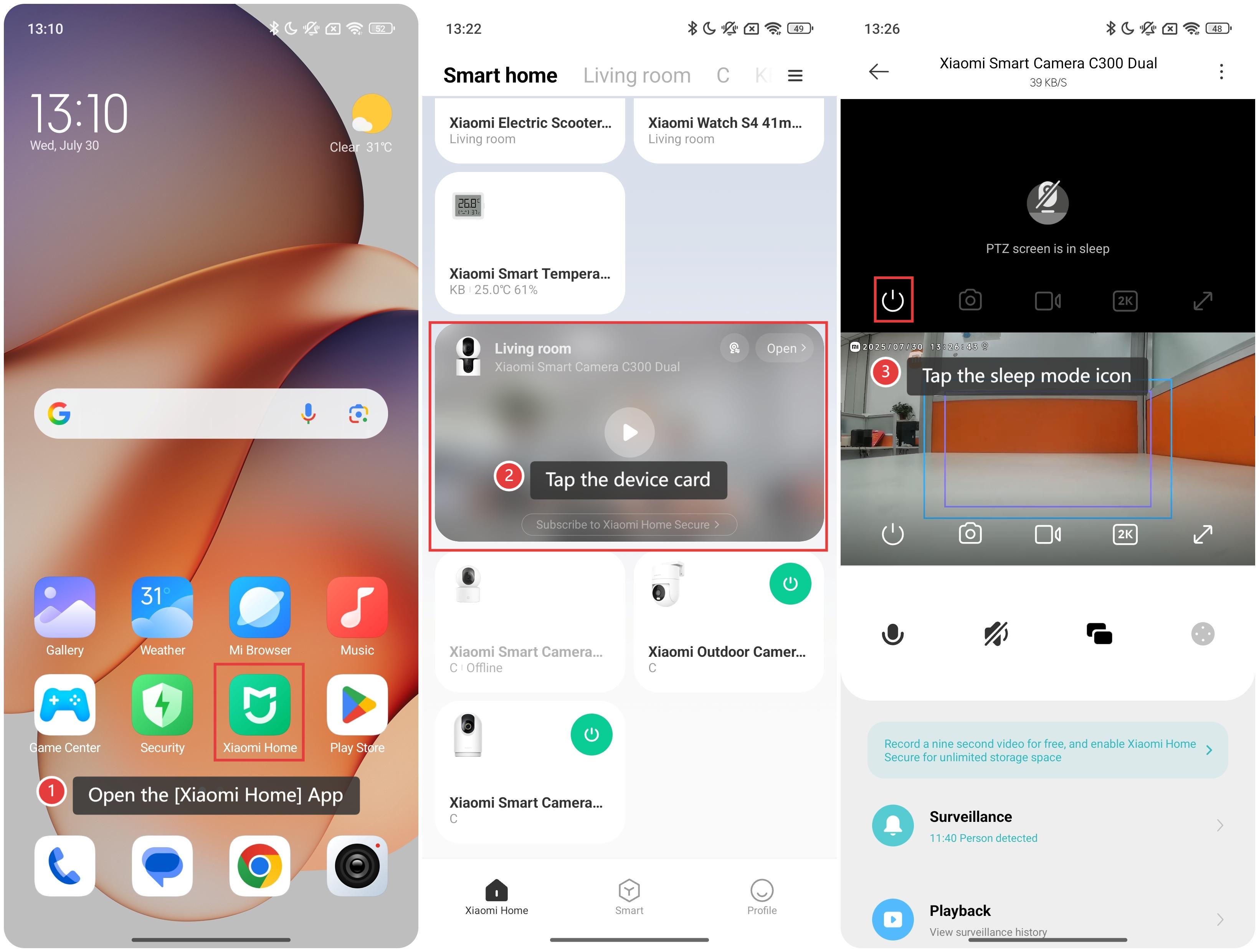 Xiaomi Smart Camera C300 Dual memiliki fitur mode tidur yang memungkinkan Anda menonaktifkan kamera sementara tanpa memutuskannya dari daya atau Wi-Fi. Fitur ini sangat ideal saat Anda ingin menjeda pemantauan untuk privasi, seperti selama pertemuan keluarga atau waktu pribadi. Anda dapat dengan mudah mengaktifkan atau menonaktifkan mode tidur kapan saja hanya dengan satu ketukan.