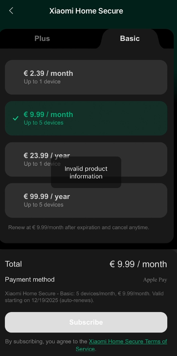 J: Setiap akun Xiaomi dapat membeli hingga empat layanan Xiaomi Home Secure. Jika Anda mencoba membeli lebih banyak setelah mencapai batas ini, pesan yang bertuliskan "Informasi produk tidak valid" akan muncul.
