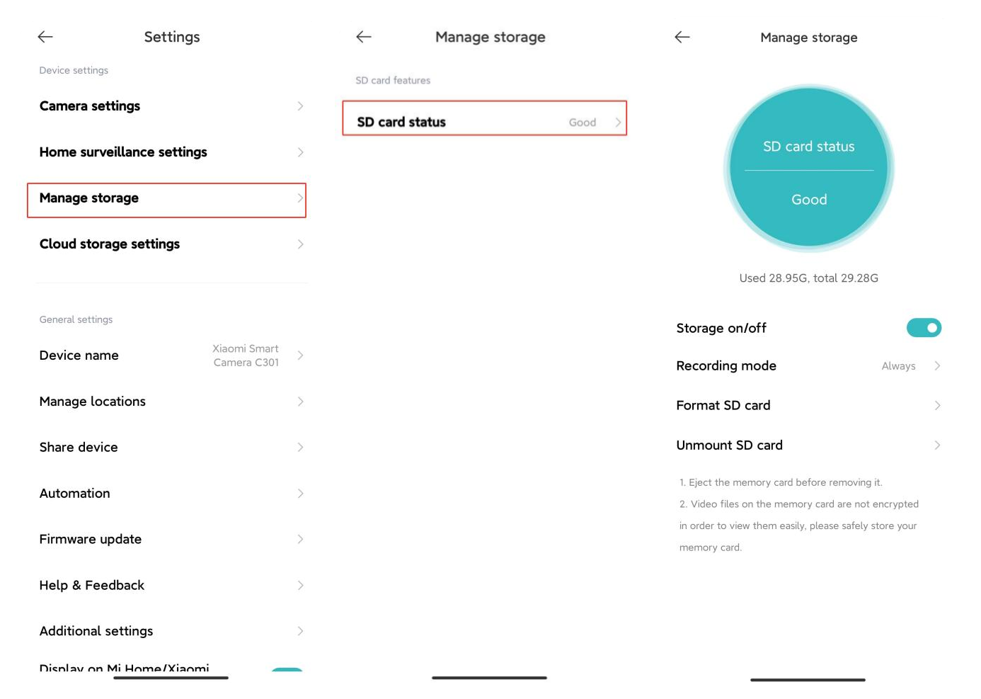 3. Jika kartu memori gagal merekam video atau tidak menghapus file secara otomatis, format kartu memori menggunakan pengaturan penyimpanan kamera dalam Aplikasi Xiaomi Home.