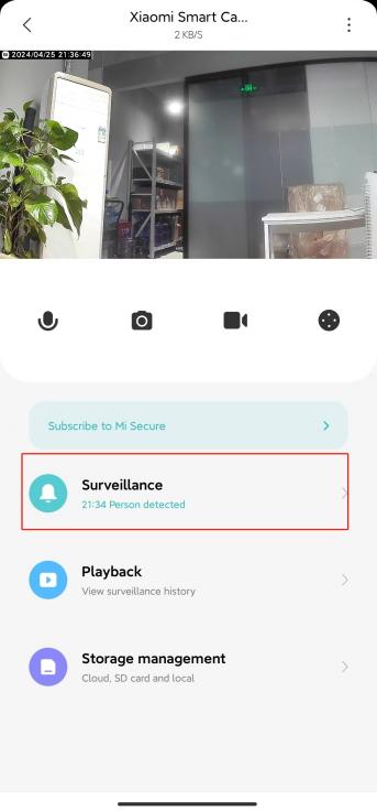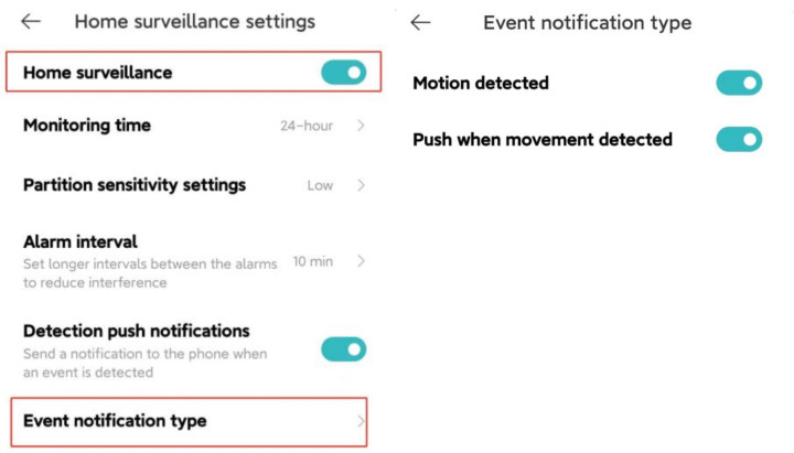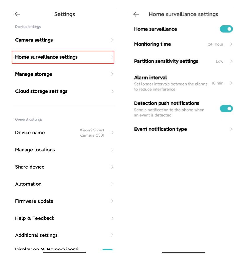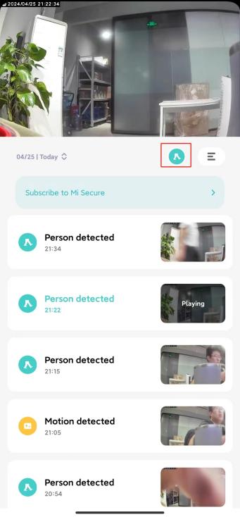 A: Silakan buka Aplikasi Xiaomi Home>> pilih kartu [Perangkat] >>ketuk tombol "..." di sudut kanan atas>>verifikasi jika [Pengawasan rumah] dan [Jenis pemberitahuan acara] diaktifkan.