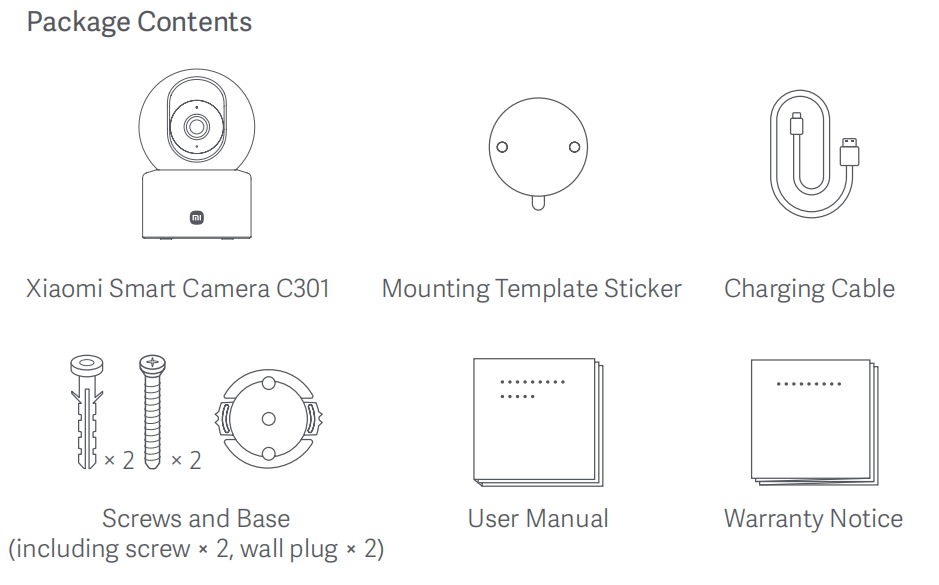 Xiaomi Smart Camera C301 × 1, Stiker Templat Pemasangan × 1, Kabel Pengisi Daya × 1, Sekrup dan Dasar (Termasuk sekrup × 2, steker dinding × 2), Panduan Pengguna × 1, dan Pemberitahuan Garansi × 1.