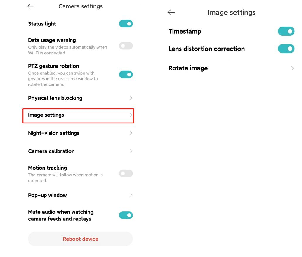 Buka Aplikasi Xiaomi Home>> pilih [Kartu Perangkat] >> ketuk ikon tiga titikdi sudut kanan atas >> [Pengaturan kamera] >>pilih [Pengaturan gambar]>> Anda dapat memilih [Stempel waktu], [Koreksi distorsi lensa], dan [Putar gambar] (Pengaturan ini diperlukan saat kamera terbalik).