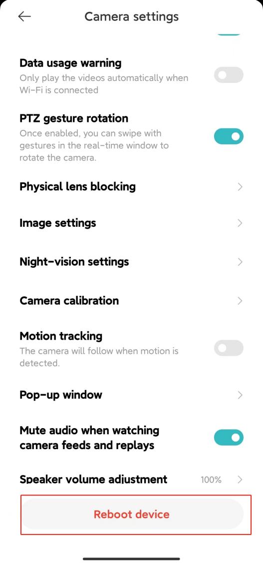 Buka Aplikasi Rumah Xiaomi>> pilih [Kartu Perangkat] >> ketuk ikon tiga titikdi sudut kanan atas >> [Pengaturan kamera] >> ketuk [Nyalakan ulang perangkat].