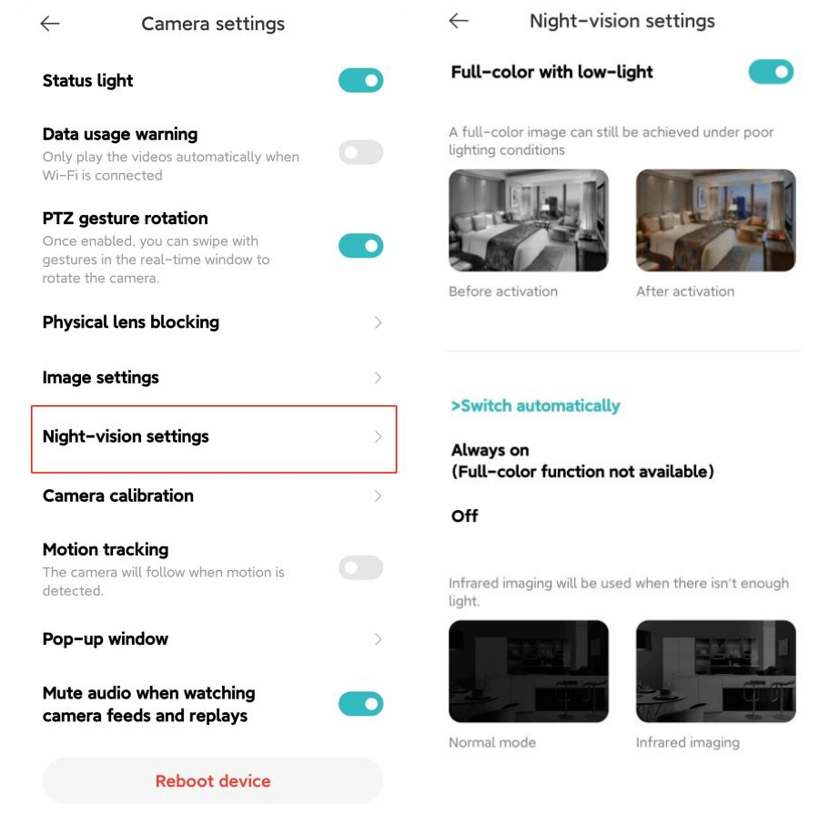 Buka Aplikasi Rumah Xiaomi >> pilih [Kartu Perangkat] >> ketuk ikon tiga titikdi sudut kanan atas >> [Pengaturan kamera] >> ketuk [Pengaturan penglihatan malam] >> Anda dapat memilih [Penuh warna dengan cahaya redup] atau [Beralih secara otomatis] ([Selalu aktif], [Mati]) sebagai preferensi Anda.